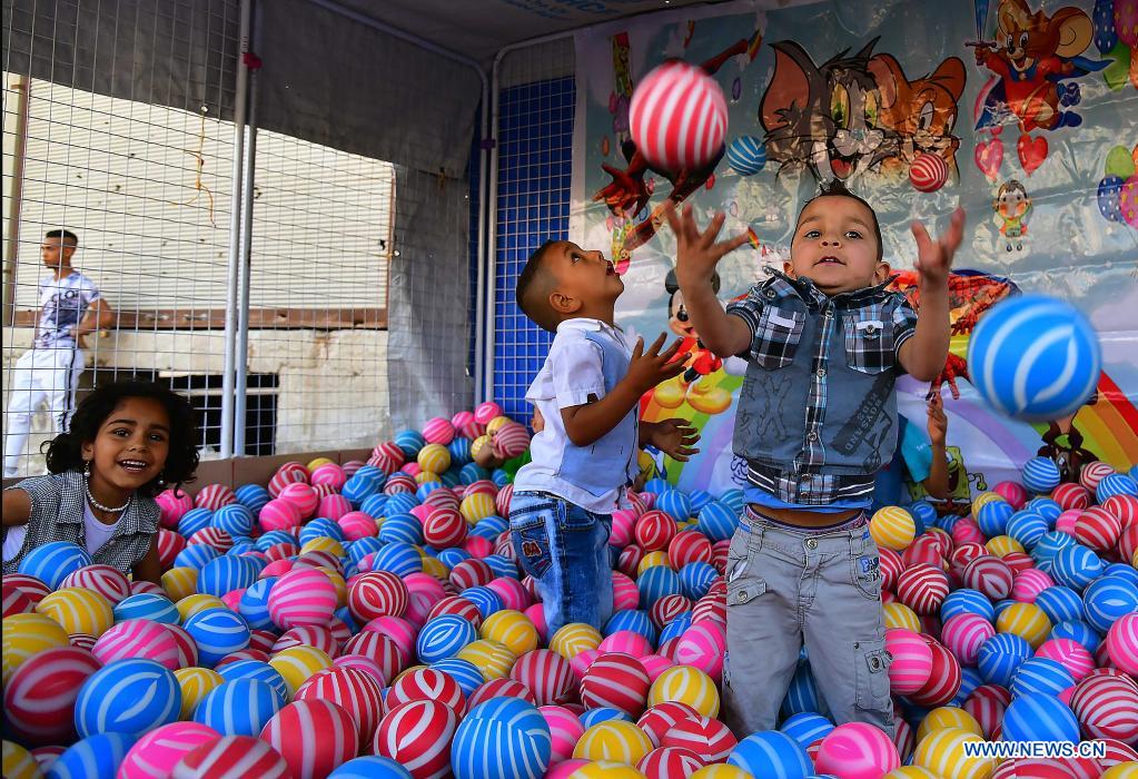 Syrian children enjoy the festive atmosphere of the Eid al-Fitr feast in Damascus, Syria, on May 13, 2021. (Photo by Ammar Safarjalani/Xinhua)