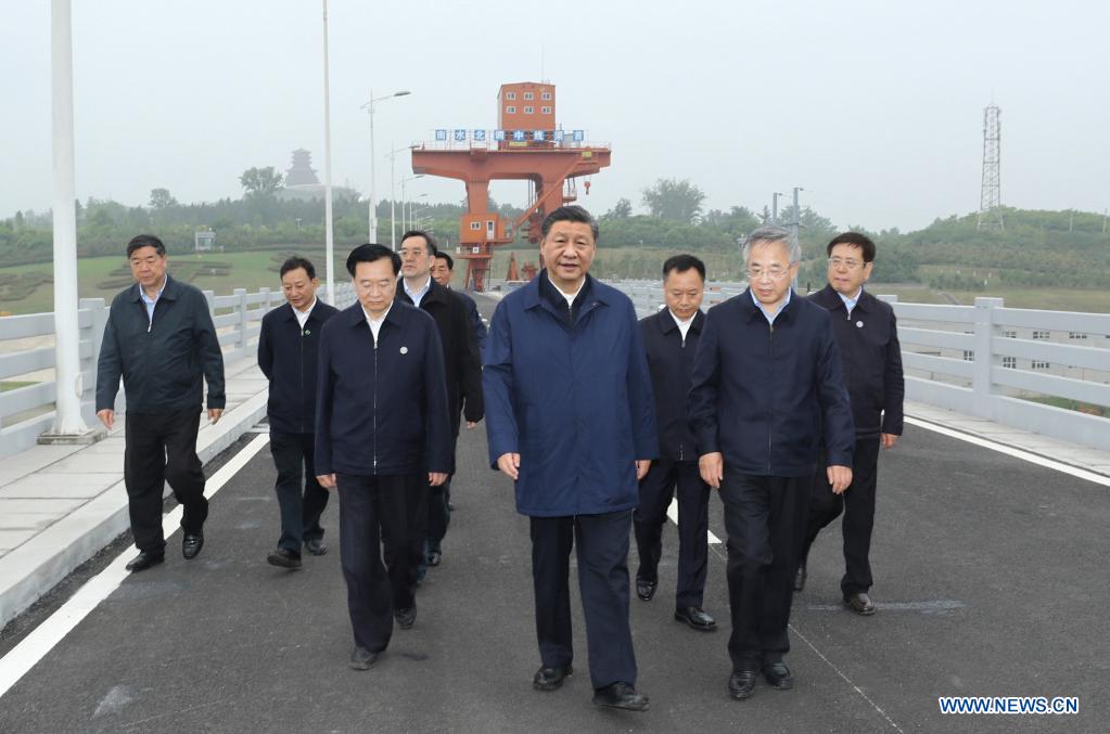 Chinese President Xi Jinping, also general secretary of the Communist Party of China Central Committee and chairman of the Central Military Commission, inspects the Taocha Canal Head before a symposium, in Xichuan County, Nanyang, central China's Henan Province, May 13, 2021. Xi Jinping on Friday convened the symposium on advancing the high-quality follow-up development of the South-to-North Water Diversion Project. (Xinhua/Ju Peng)