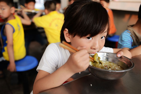 A pupil at Wenxing School in Gushi county, Henan province, eats dinner. The school only accepts the children of migrant workers. (PHOTOS BY XIANG MINGCHAO / CHINA DAILY)
