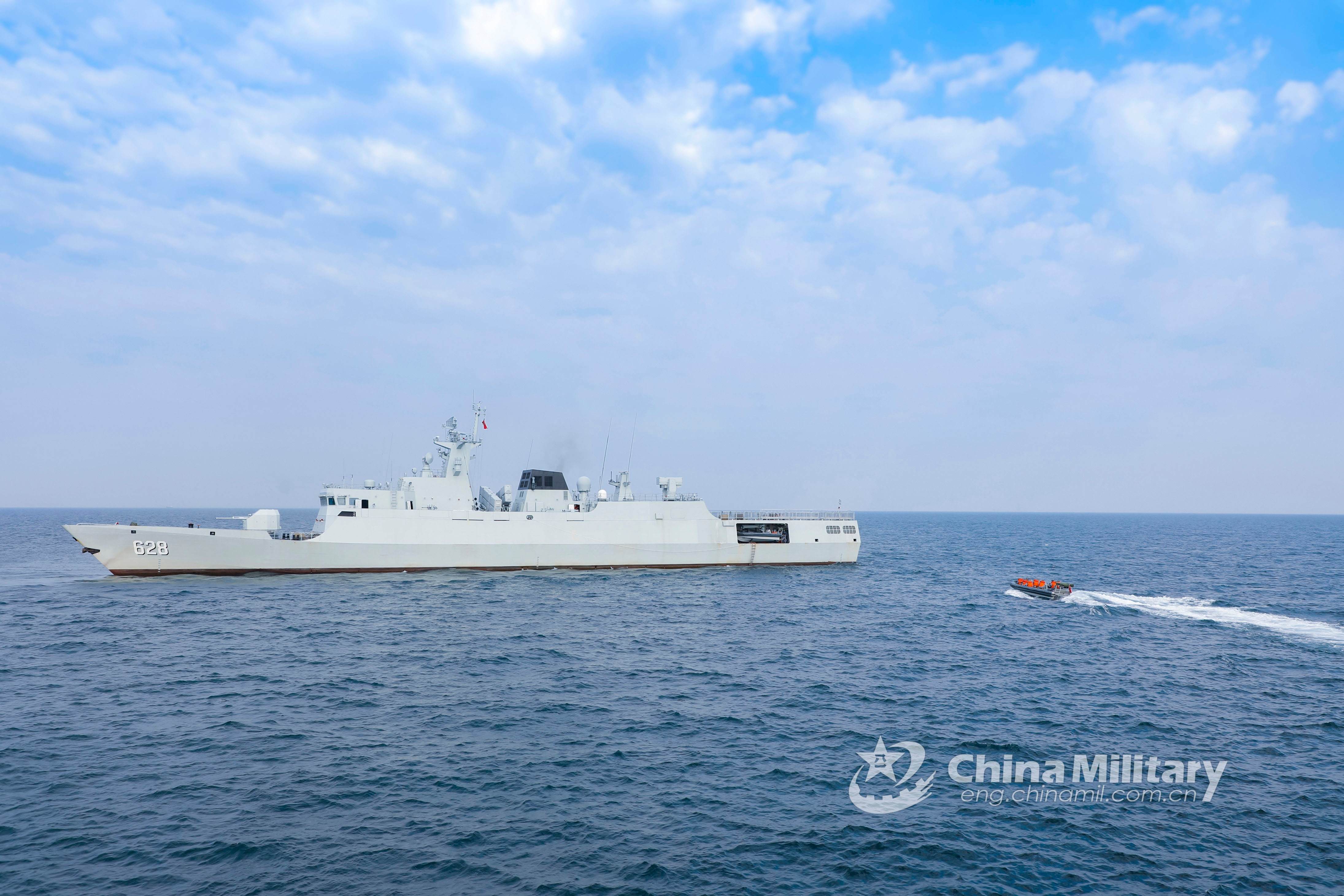 A rigid-hull inflatable boat (RHIB) speeds towards the frigate Yongzhou during a maritime combat training exercise staged by a naval frigate flotilla under PLA's Southern Theater Command on April 21, 2021. (eng.chinamil.com.cn/Photo by Zhang Bin)