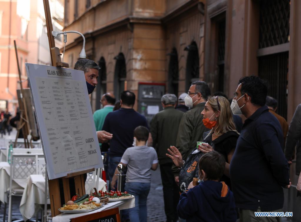 A restaurant staff member talks to customers in Rome, Italy, May 15, 2021. Italy formally opened its borders on Sunday for restriction-free travel for visitors from some countries. While it appeared that few took advantage of the eased travel rules on their first day, businesses in Rome say they are ready. (Xinhua/Cheng Tingting)