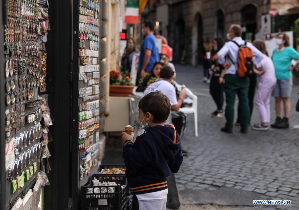 A boy chooses magnets at a souvenir shop in Rome, Italy, May 15, 2021. Italy formally opened its borders on Sunday for restriction-free travel for visitors from some countries. While it appeared that few took advantage of the eased travel rules on their first day, businesses in Rome say they are ready. (Xinhua/Cheng Tingting)