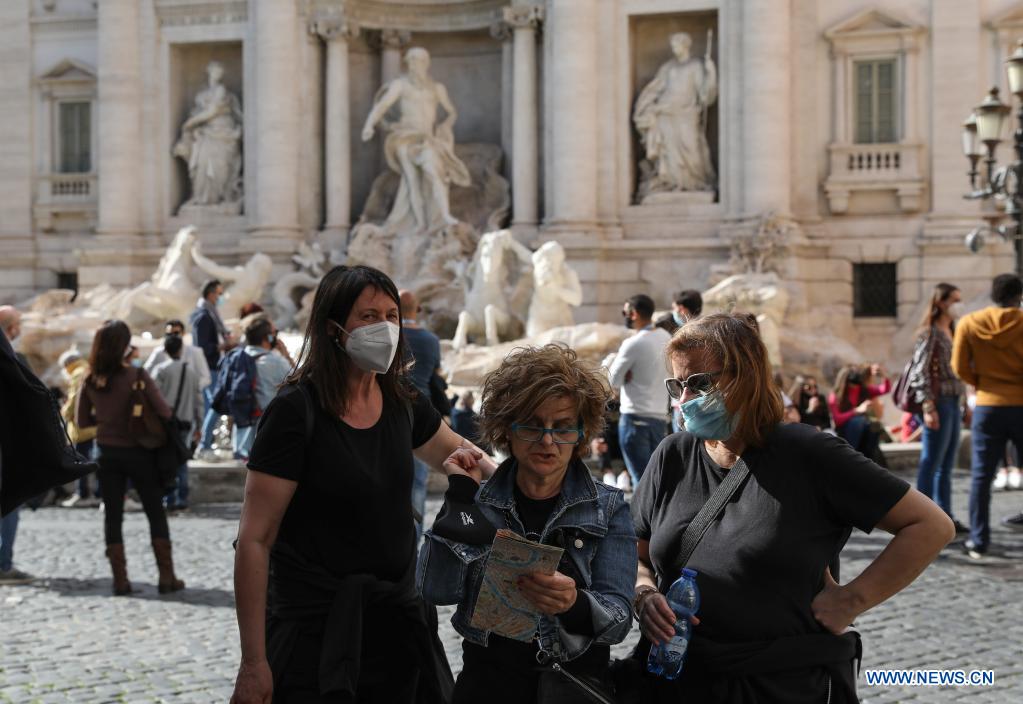 People read a map near the Fontana di Trevi in Rome, Italy, May 15, 2021. Italy formally opened its borders on Sunday for restriction-free travel for visitors from some countries. While it appeared that few took advantage of the eased travel rules on their first day, businesses in Rome say they are ready. (Xinhua/Cheng Tingting)