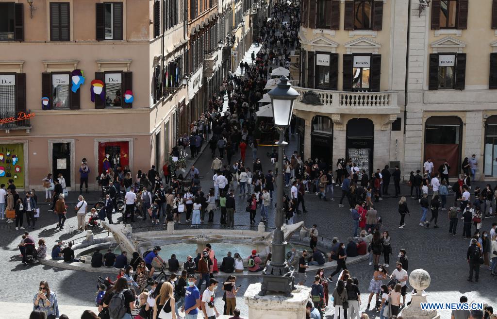 People visit the Piazza di Spagna in Rome, Italy, May 15, 2021. Italy formally opened its borders on Sunday for restriction-free travel for visitors from some countries. While it appeared that few took advantage of the eased travel rules on their first day, businesses in Rome say they are ready. (Xinhua/Cheng Tingting)