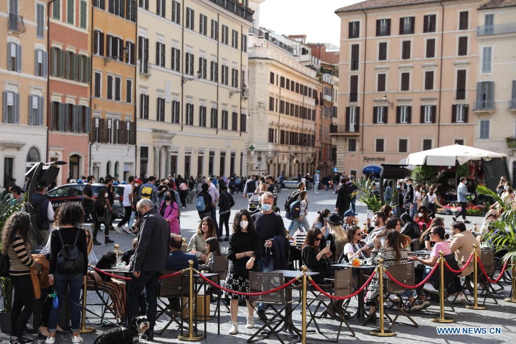 People enjoy food and drinks at a restaurant in Rome, Italy, May 15, 2021. Italy formally opened its borders on Sunday for restriction-free travel for visitors from some countries. While it appeared that few took advantage of the eased travel rules on their first day, businesses in Rome say they are ready. (Xinhua/Cheng Tingting)
