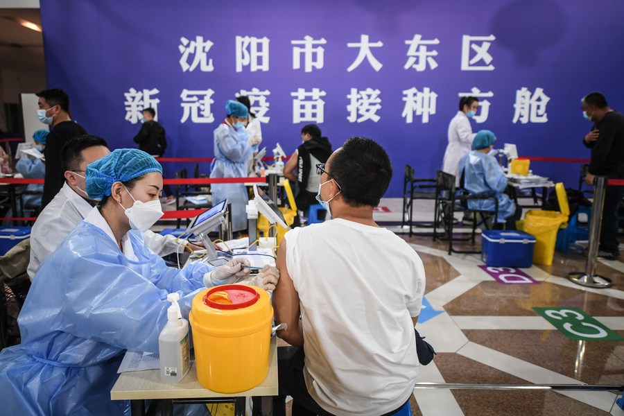 A man receives the COVID-19 vaccine at a vaccination site in Dadong District of Shenyang, northeast China's Liaoning Province, May 7, 2021. (Xinhua/Pan Yulong)