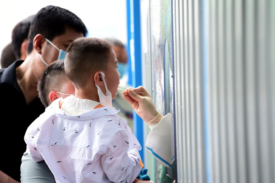 A medical worker collects a swab sample from a child for nucleic acid testing at a hospital in Feixi County of east China' Anhui Province, May 15, 2021. (Xinhua/Huang Bohan)