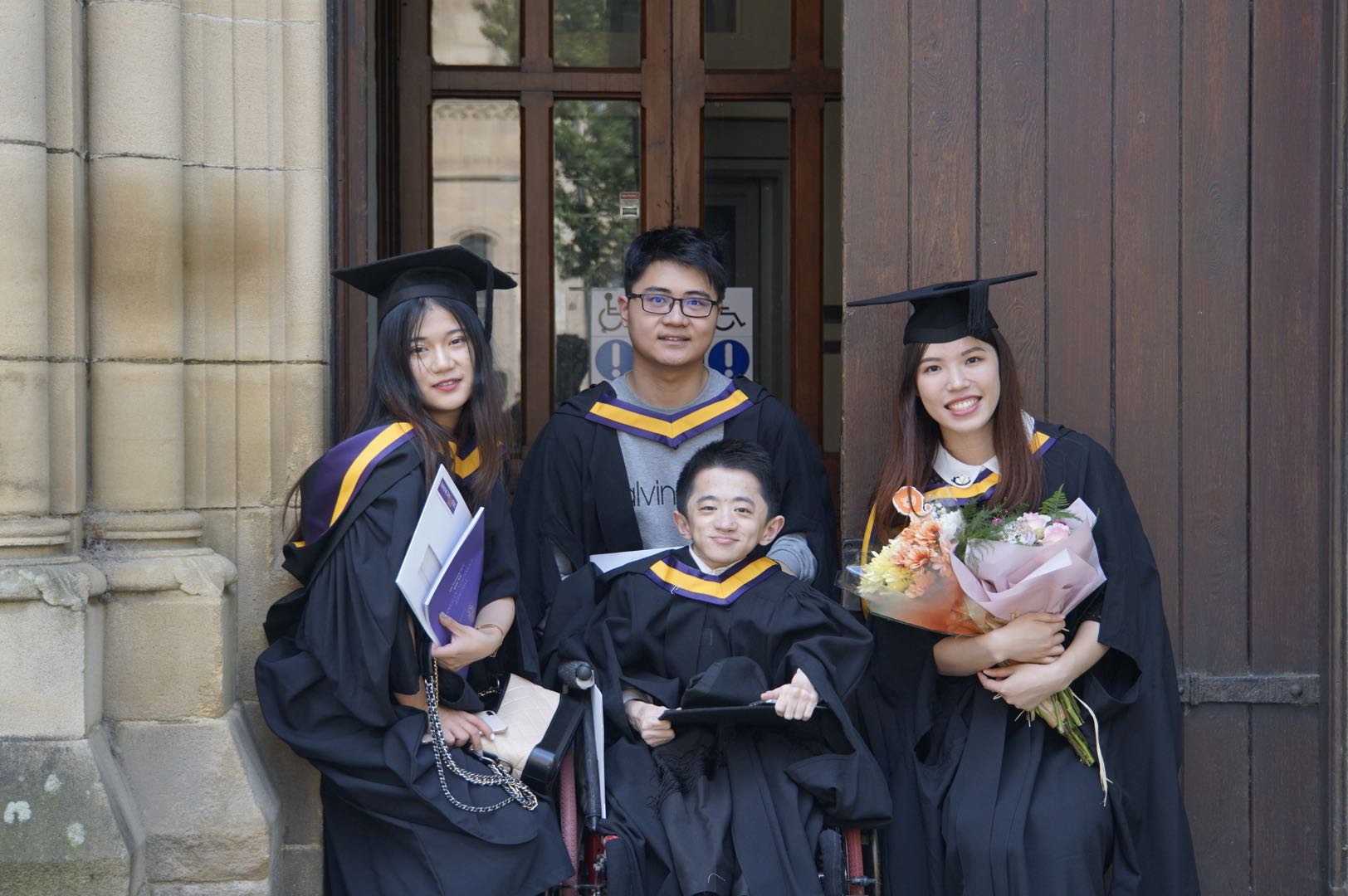 Liu Daming (C, front) poses for a group photo with his schoolmates during a graduation ceremony at the University of Manchester in Britain in 2019. (Xinhua)