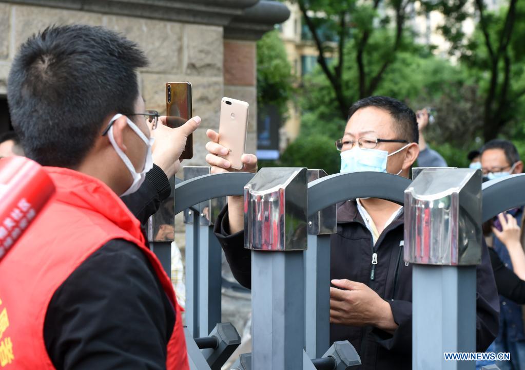 A resident (R) scans a QR code to pay a volunteer who purchases daily necessities for him at the entrance of a community in Yu'an District of Lu'an City, east China's Anhui Province, May 17, 2021. The city of Lu'an in east China's Anhui Province has raised the COVID-19 alert levels from low-risk to medium-risk in four residential communities, the city's health commission said on Monday. The city currently has six areas classified as medium-risk. (Xinhua/Zhou Mu)