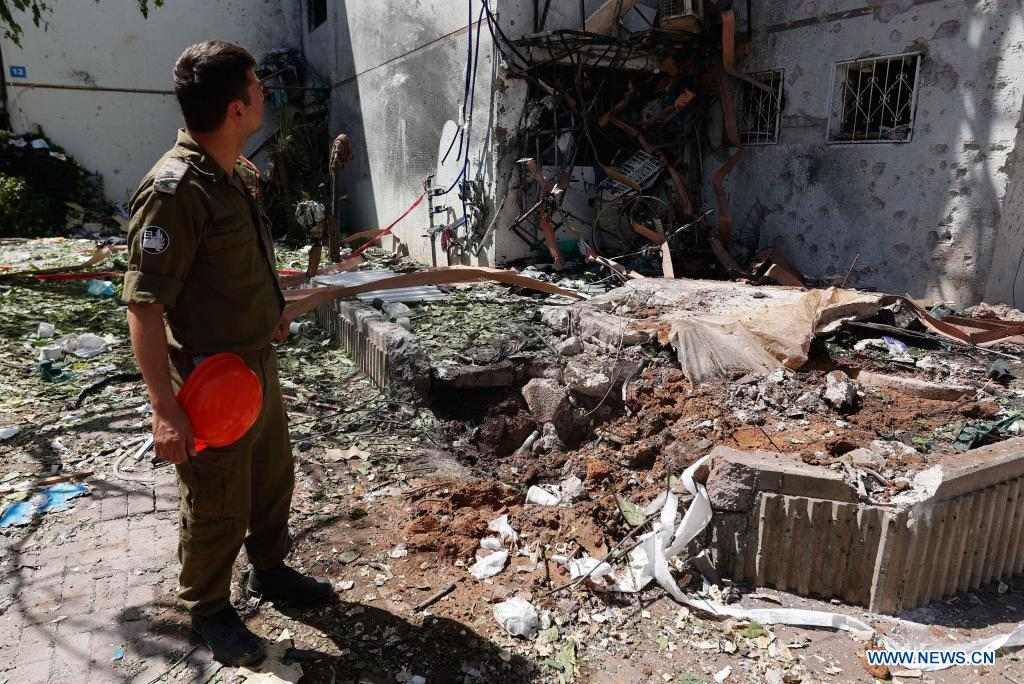 A man inspects a building hit by a rocket fired from the Gaza Strip, in southern Israeli city of Ashdod, on May 17, 2021. A rocket hit a residential building in Ashdod city on Monday, causing damage and injuring three people, according to a statement by Israel's Magen David Adom emergency health service. The intense fighting between Israel and Gaza's ruler Hamas killed 204 Palestinians, including 59 children, and 10 Israelis, including a five-year-old boy and a soldier. (Ilan Assayag/JINI via Xinhua)