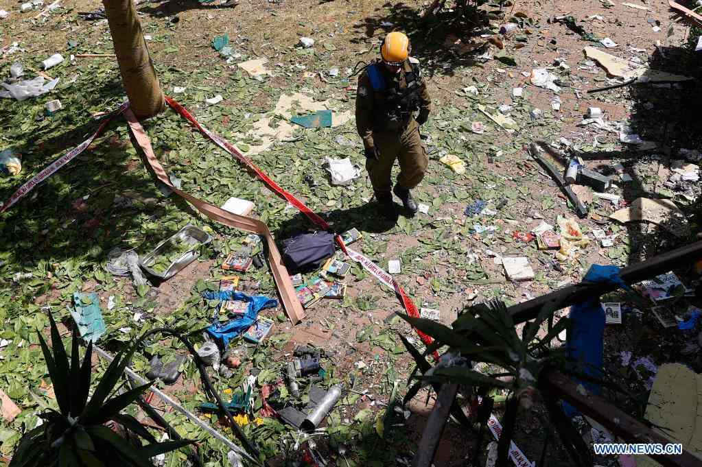 A member of Israeli security forces inspects a building hit by a rocket fired from the Gaza Strip, in southern Israeli city of Ashdod, on May 17, 2021. A rocket hit a residential building in Ashdod city on Monday, causing damage and injuring three people, according to a statement by Israel's Magen David Adom emergency health service. The intense fighting between Israel and Gaza's ruler Hamas killed 204 Palestinians, including 59 children, and 10 Israelis, including a five-year-old boy and a soldier. (Ilan Assayag/JINI via Xinhua)