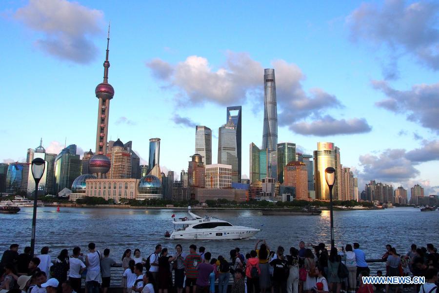 People enjoy the view of Lujiazui at the Bund in east China's Shanghai, Aug. 2, 2019. (Photo/Xinhua)
