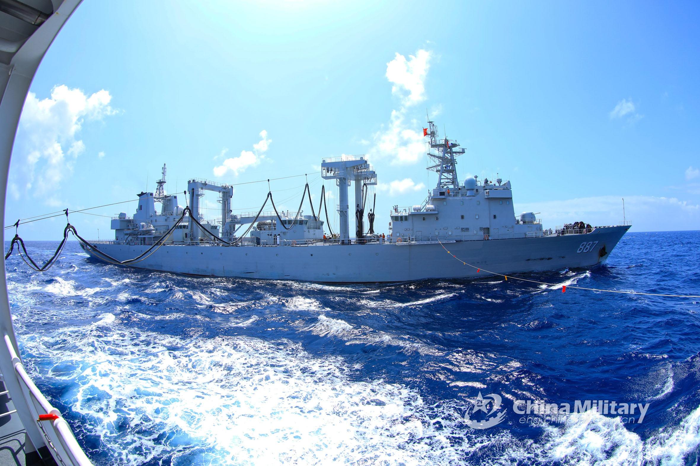 Replenishment-at-sea vessels attached to a naval base under the PLA Southern Theater Command perform alongside liquid cargo replenishment- during a replenishment-at-sea training exercise in mid-April, 2021. (eng.chinamil.com.cn/Photo by Xue Chengqing)