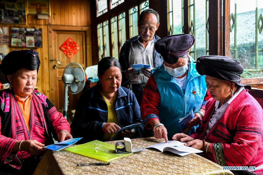 Pan Jiping (2nd, R) introduces pandemic prevention knowledge at Xiaozhai Village of Longji Township, Longsheng County, south China's Guangxi Zhuang Autonomous Region, May 18, 2021. In Xiaozhai, a village at the foot of Fupingbao Mountain over 1,900 meters above sea level, Pan Jiping has been a country doctor here for more than 30 years. Pan, 57, is one of the Hongyao people, a branch of the Yao ethnic group. In 1988, Pan went to the county's health school to study medicine in order to solve the villagers' difficulty in seeing a doctor. In 1990, after finishing her studies, Pan returned to Xiaozhai Village and became the first village doctor who has received formal training in the village. Since then, Pan has always met the needs of local villagers without delay and won their trust and praise. Nowadays, with the improvement of traffic and living standards, more and more villagers have begun to seek medical service in the town and county. Pan has then become a contracted family doctor for the villagers. She often makes home visits to villagers, conducts regular examination for the elderly and establishes health records for the villagers. "As long as the villagers need me, I will keep working as a village doctor," Pan said. (Xinhua/Cao Yiming)