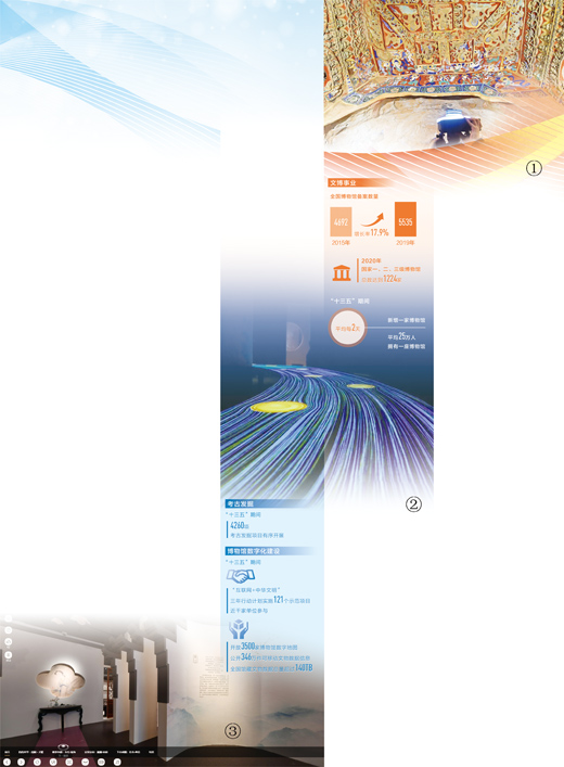 1. Staff workers collect image data of the Yungang Grottoes at the Yungang Grottoes Research Institute in Datong, north China's Shanxi province. (Photo/Zhan Yan) 2. Photo shows a digital exhibition of national treasures held in Jinan, east China's Shandong province. (File photo) 3. Anhui Museum launches an online exhibition of relics depicting women from the Ming and Qing dynasties in Huizhou (an administrative district in Chinese history and now part of Anhui). (File photo) Data from the National Cultural Heritage Administration of China.