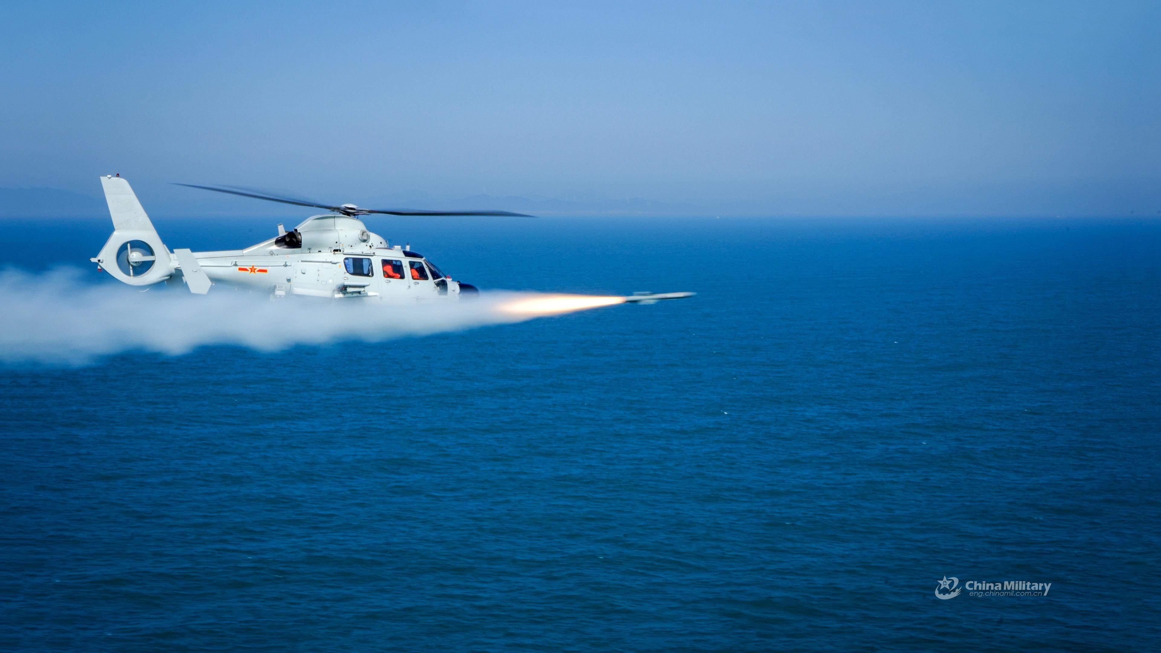 A ship-borne helicopter attached to an naval aviation regiment under the PLA Eastern Theater Command fires a missile at mock target during a live-fire training exercise in early May, 2021. (eng.chinamil.com.cn/Photo by Sun Wei)