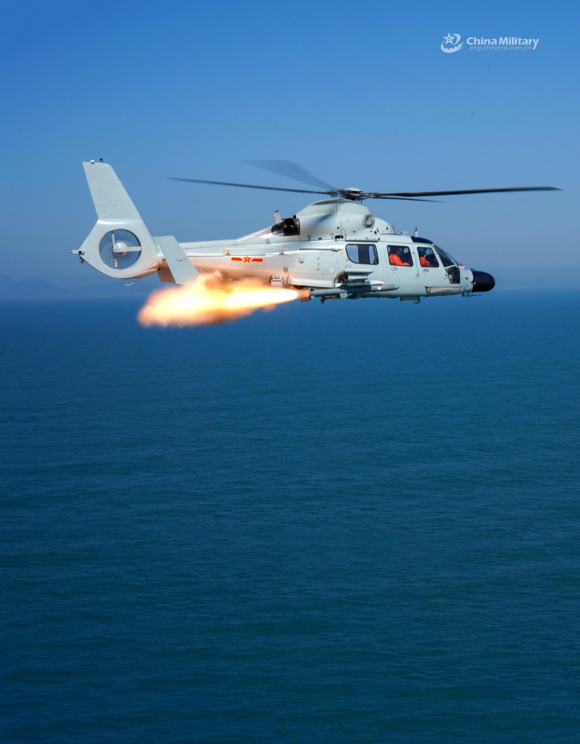 A ship-borne helicopter attached to an naval aviation regiment under the PLA Eastern Theater Command fires a missile at mock target during a live-fire training exercise in early May, 2021. (eng.chinamil.com.cn/Photo by Sun Wei)