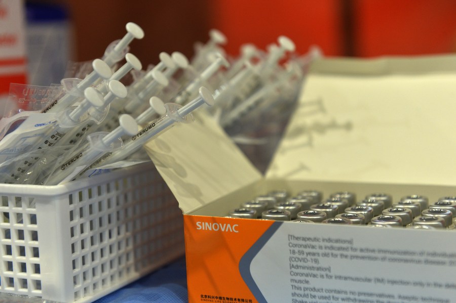 Photo taken on May 12, 2021 shows COVID-19 vaccine developed by Chinese pharmaceutical company Sinovac at a COVID-19 vaccination center in Bangkok, Thailand. (Xinhua/Rachen Sageamsak)