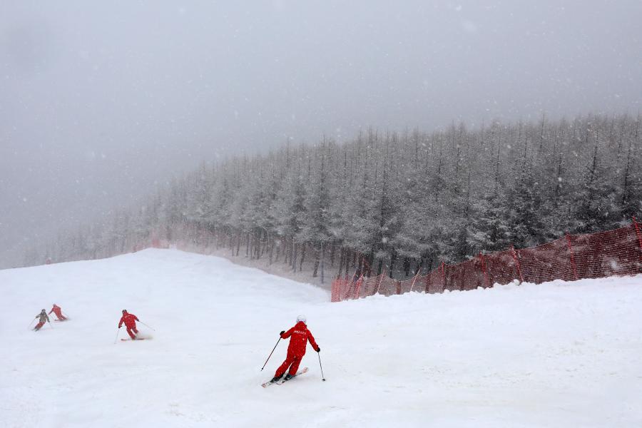 People ski at a ski field during a snowfall in Chongli District of Zhangjiakou City, north China's Hebei Province, Nov. 18, 2020. (Photo by Wu Diansen/Xinhua)