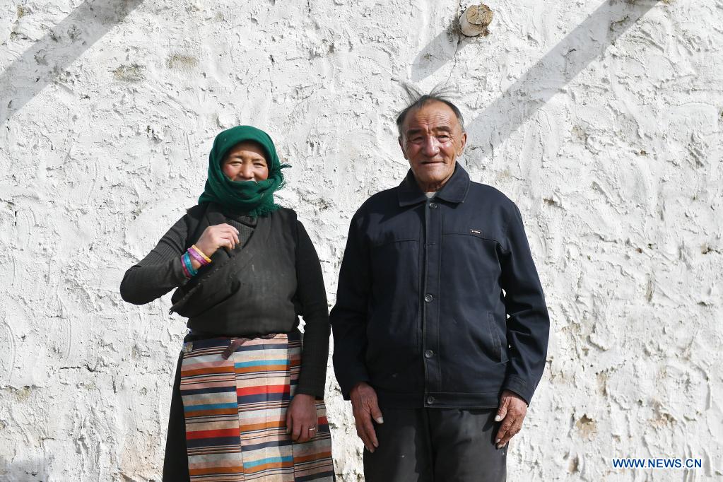 Tendar poses for a photo with his daughter in Damxung County, southwest China's Tibet Autonomous Region, April 16, 2021. Tendar, born in 1940, was a serf and lived under cruel feudal serfdom before the democratic reform in Tibet in 1959. Like many other serf children, Tendar grew up with hunger. He said that in old Tibet, he shivered with cold in the corner of the air-leaking tent every night, looking forward to a full meal. After the democratic reform, Tendar was distributed with lands and livestock, and lives a happy life now. (Xinhua/Sun Ruibo)