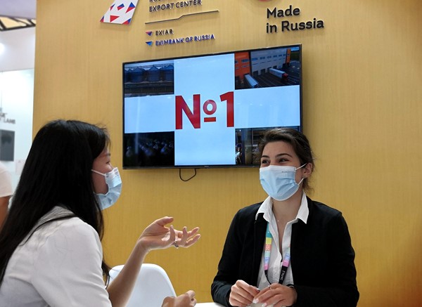 A Russian exhibitor discusses business with a guest at the 22nd SIAL China. (People’s Daily Online/Sun Boyang)