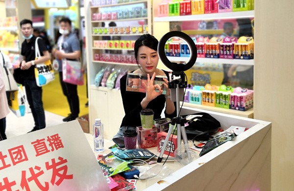 An e-commerce live-streamer promotes products during her live-streaming sales session at the 22nd SIAL China. (People’s Daily Online/Sun Boyang)