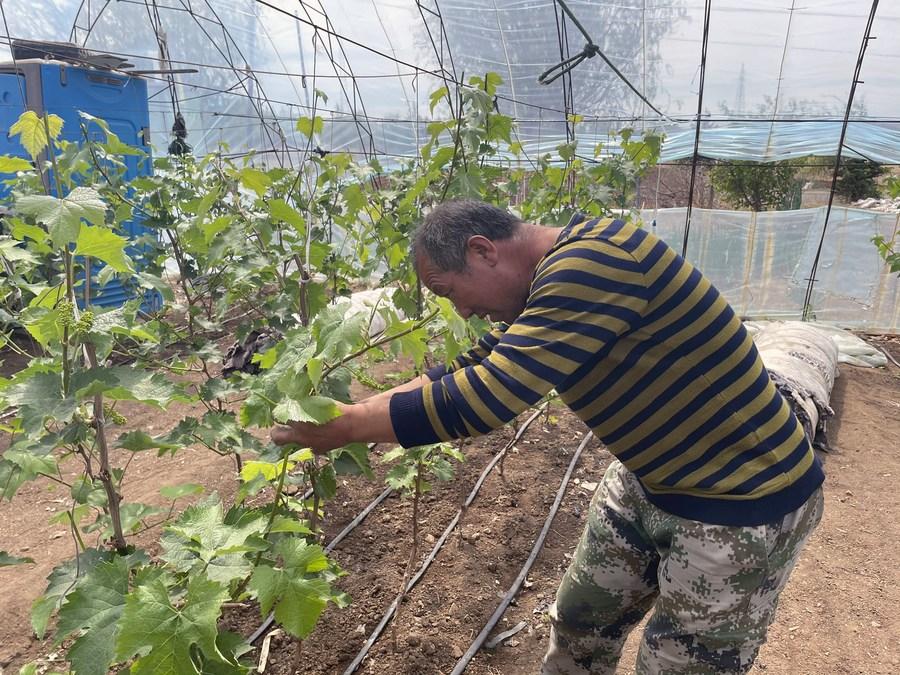 A photo shows a farmer working in his greenhouse in a village in Hinggan League, north China's Inner Mongolia Autonomous Region, May 15, 2021. (Xinhua/Zhang Yuyang)