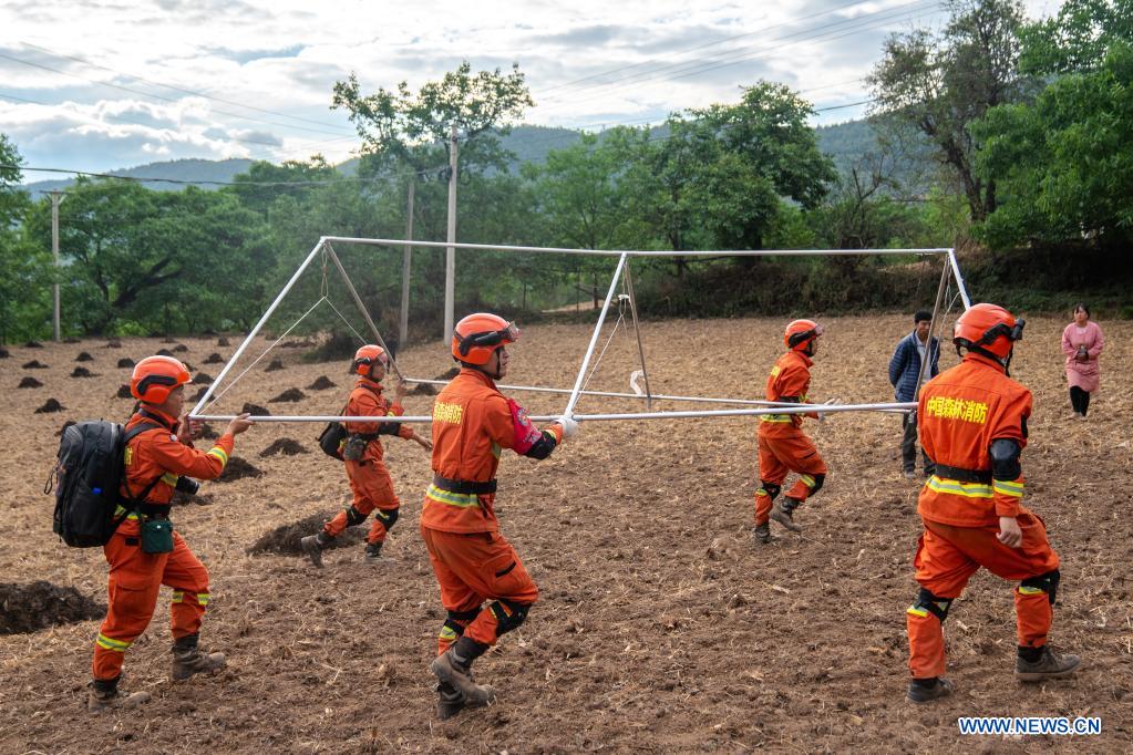 Rescuers build shelters in Xiuling Village of Yangbi Yi Autonomous County, southwest China's Yunnan Province, May 22, 2021. Four earthquakes over 5.0-magnitude struck Yangbi Yi Autonomous County in Dali Bai Autonomous Prefecture of Yunnan from 9 p.m. to 11 p.m. Friday Beijing Time. The tremors were felt in all 12 counties and cities of the prefecture, with Yangbi being the worst hit. So far, over 16,200 rescuers and relief materials including tents and daily necessities have been dispatched to the quake area. Over 22 million yuan (about 3.4 million U.S. dollars) has been allocated for emergency relief. Yangbi has arranged 380 centralized settlement sites for over 85,000 affected people. (Xinhua/Hu Chao)