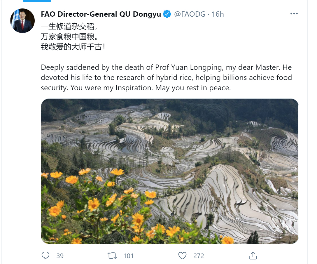 "Deeply saddened by the death of Prof Yuan Longping, my dear Master. He devoted his life to the research of hybrid rice, helping billions achieve food security," wrote Qu on his Twitter account.