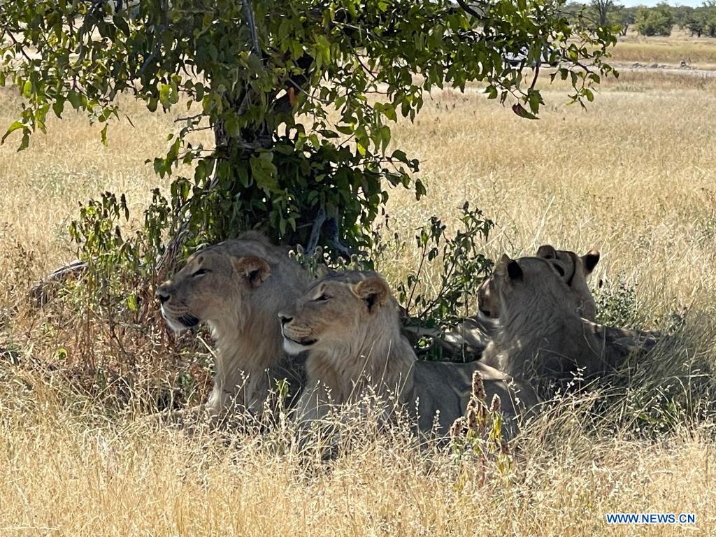 Photo taken on May 15, 2021 shows lions in Etosha National Park, Namibia. Namibia is home to an array of wildlife, from ostriches and zebras roaming the gravel plains to penguins and seals chilling in the Atlantic currents. (Photo by Wang Peng/Xinhua)