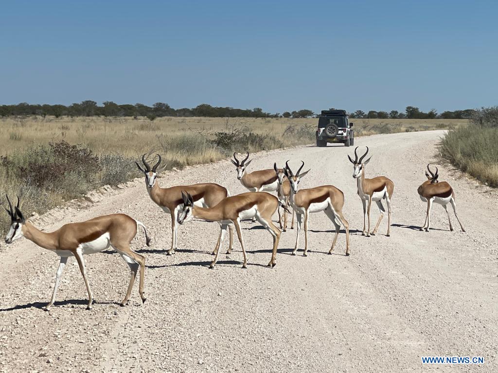 Photo taken on May 15, 2021 shows springboks in Etosha National Park, Namibia. Namibia is home to an array of wildlife, from ostriches and zebras roaming the gravel plains to penguins and seals chilling in the Atlantic currents. (Photo by Wang Peng/Xinhua)
