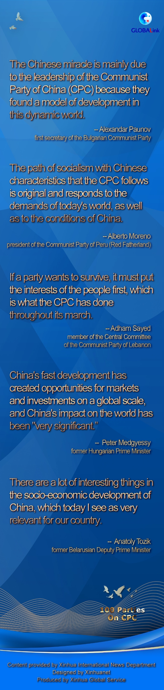 Party leaders and senior officials of different countries recently expressed appreciation for China's achievements, noting that China's success, a result of the CPC's strong leadership and a right development path, offers significant inspiration for other countries in pursuit of their own development.
