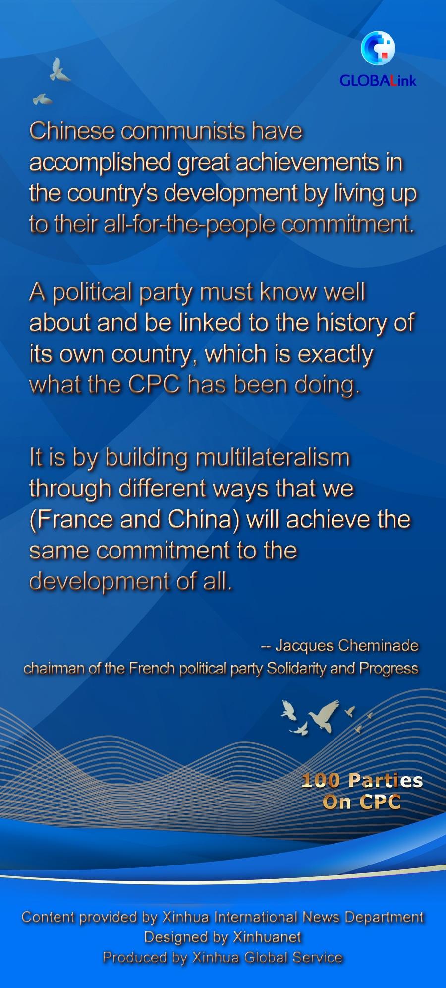 BEIJING, May 24 (Xinhua) -- Chinese communists have accomplished great achievements in the country's development by living up to their all-for-the-people commitment, Jacques Cheminade, chairman of the French political party Solidarity and Progress, recently told Xinhua via video link.