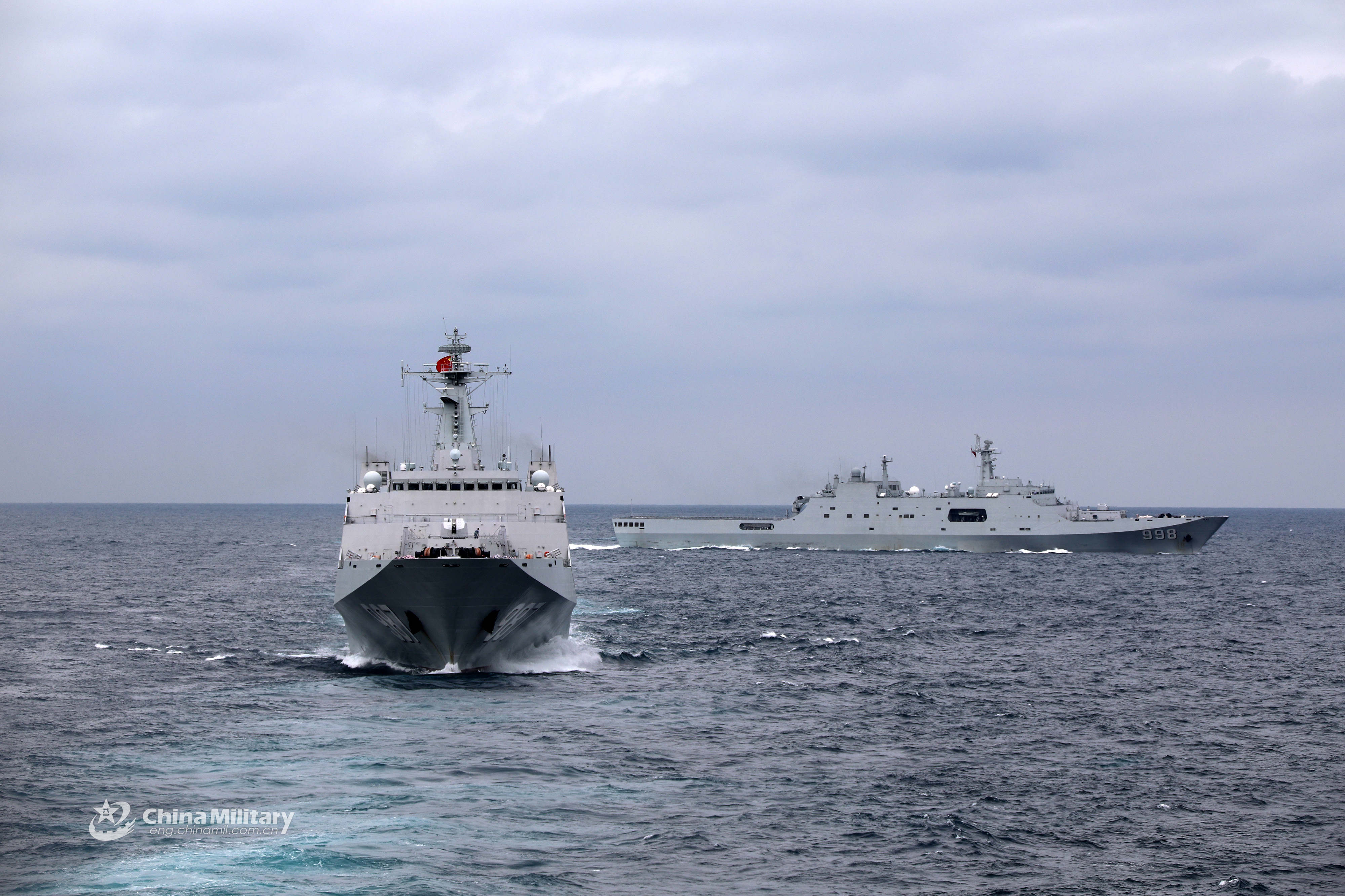 Vessels attached to a naval landing ship flotilla under the PLA Southern Theater Command change the formation pattern during acombattraining exercise inlate April, 2021. (eng.chinamil.com.cn/Photo by GuYagen)