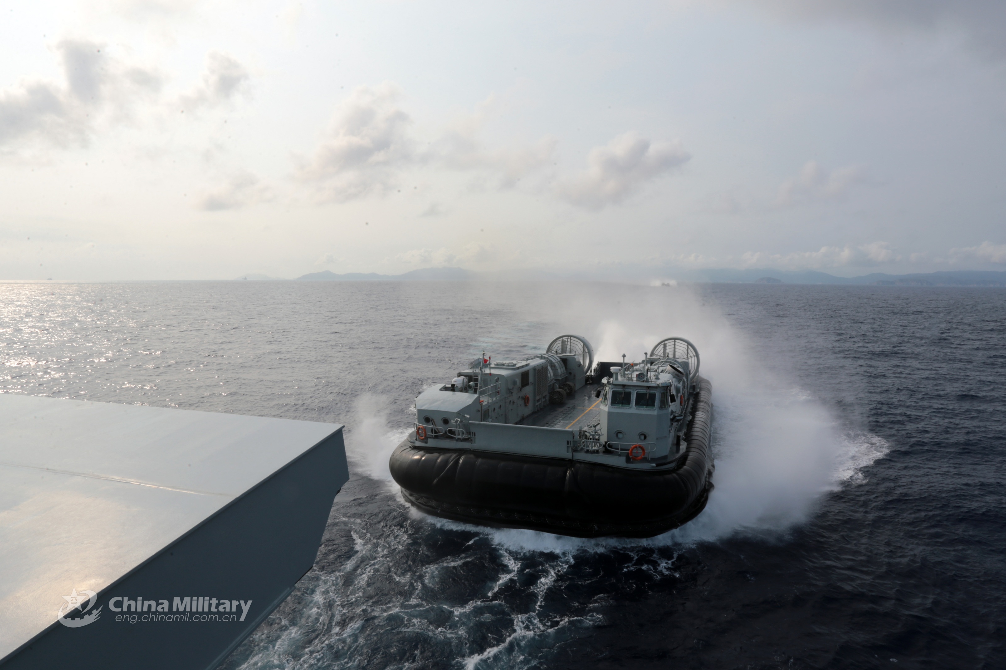 A Landing Craft Air Cushion (LCAC) attached to a naval landing ship flotilla under the PLA Southern Theater Command approaches the well deck of the amphibious dock landing ship during a combat training exercise in late April, 2021. (eng.chinamil.com.cn/Photo by Liu Jinyu)