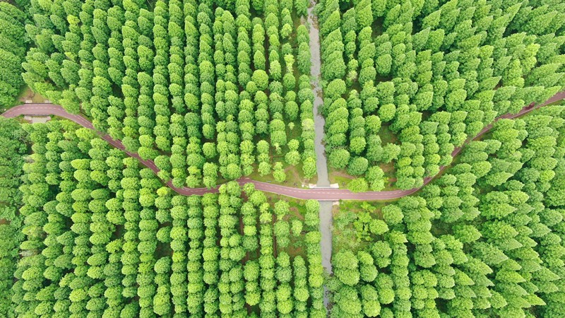 Photo taken on May 13, 2021, shows an aerial view of the picturesque Huanghai National Forest Park in east China's Jiangsu province. (People's Daily Online/Xu Congjun)
