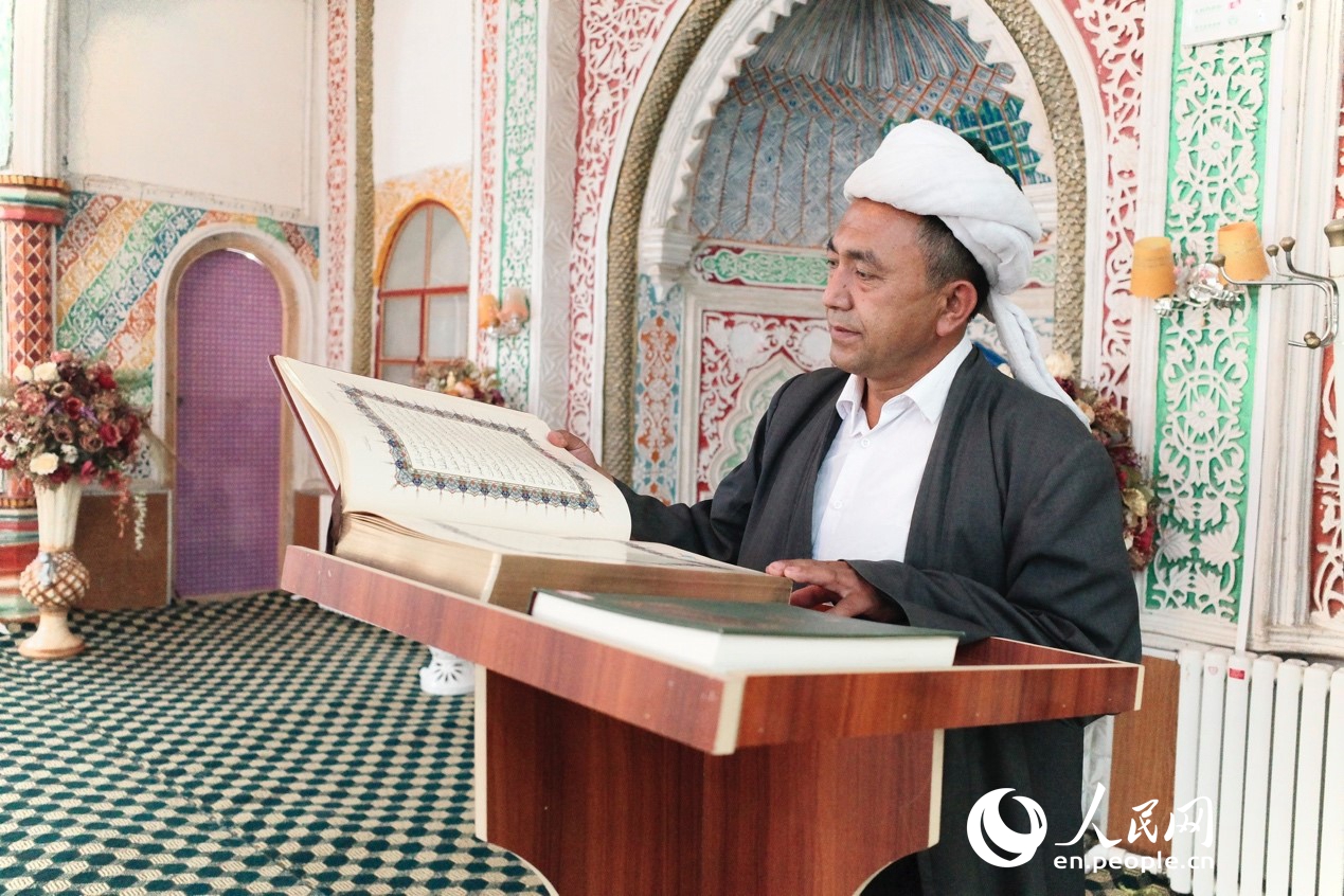 Abdurusul observes a religious ritual at Ujmilik Mosque in Hotan, northwest China's Xinjiang Uygur Autonomous Region. (People's Daily Online/Kou Jie)