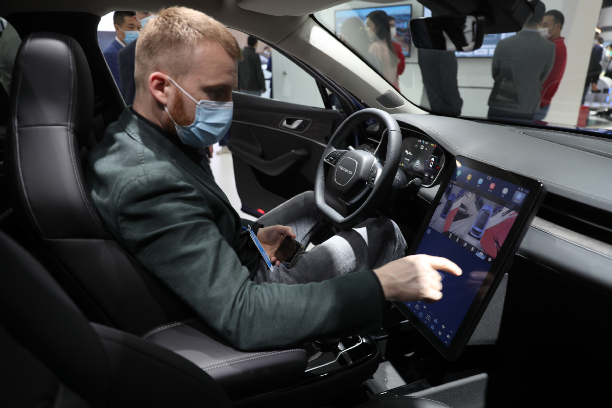 A visitor tries Huawei's HarmonyOS operating system on a car dashboard during an auto expo in Shanghai. [Photo by Zhang Hengwei/China News Service]