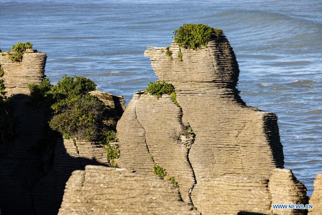 Photo taken on May 25, 2021 shows a view of the Pancake Rocks in Punakaiki on the West Coast of the South Island, New Zealand. The Pancake Rocks were formed from minute fragments of dead marine creatures and plants landed on the seabed. (Photo by Zhang Jianyong/Xinhua)