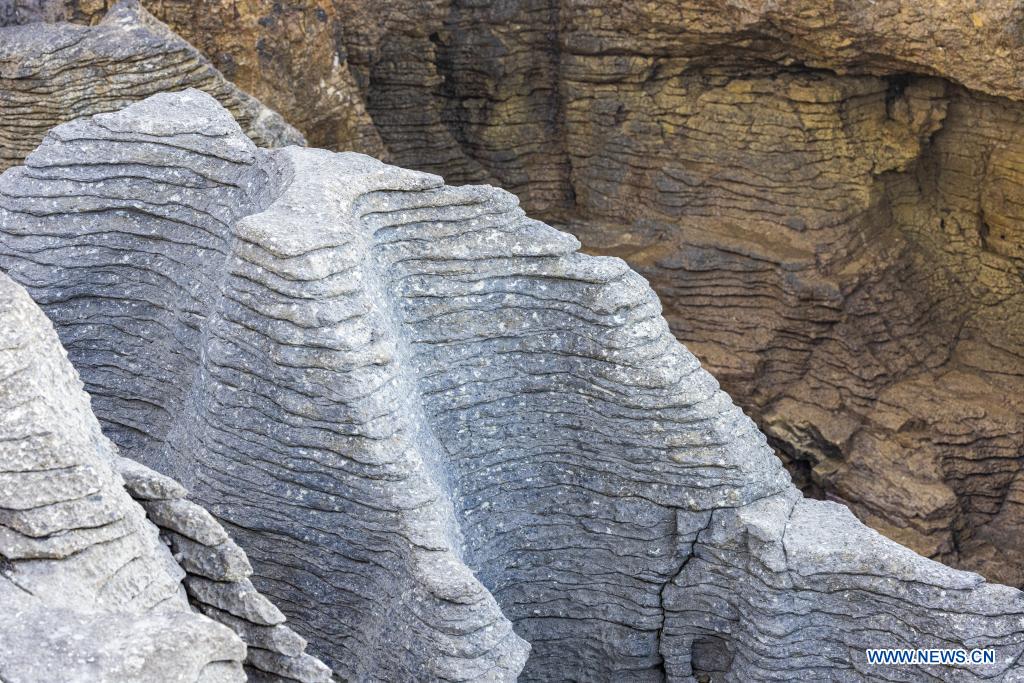 Photo taken on May 25, 2021 shows a view of the Pancake Rocks in Punakaiki on the West Coast of the South Island, New Zealand. The Pancake Rocks were formed from minute fragments of dead marine creatures and plants landed on the seabed. (Photo by Zhang Jianyong/Xinhua)
