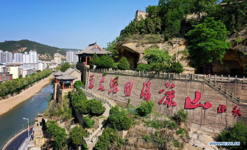 Aerial photo taken on May 9, 2021 shows the Qingliang Mountain in Yan'an City, northwest China's Shaanxi Province. Yan'an in northwest China's Shaanxi Province hosted the then headquarters of the Communist Party of China (CPC) and was the center of the Communist revolution from 1935 to 1948. The city is home to 445 former sites of the CPC's early revolutionary activities and boasts 30 revolution-themed museums. The city on the Loess Plateau has witnessed locals bid farewell to poverty. It has been green-coated thanks to its greening efforts. Bridging past and present, a new cityscape in the former revolutionary base is taking shape. (Xinhua/Liu Xiao)