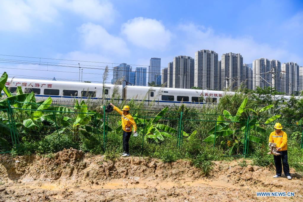 Railway staff members pick up light objects near a railroad section in Nanning, south China's Guangxi Zhuang Autonomous Region, May 26, 2021. Random light objects such as broken kites, floating balloons, and drifting plastic films pose significant threats to the safe operation of high-speed railway lines, affecting the order of the railway network or causing irreversible damage to the overhead contact system equipment at worst. The duty of a group of railway staff members is to regularly patrol the routes to clean off these objects from the railway grid in time. (Xinhua/Cao Yiming)