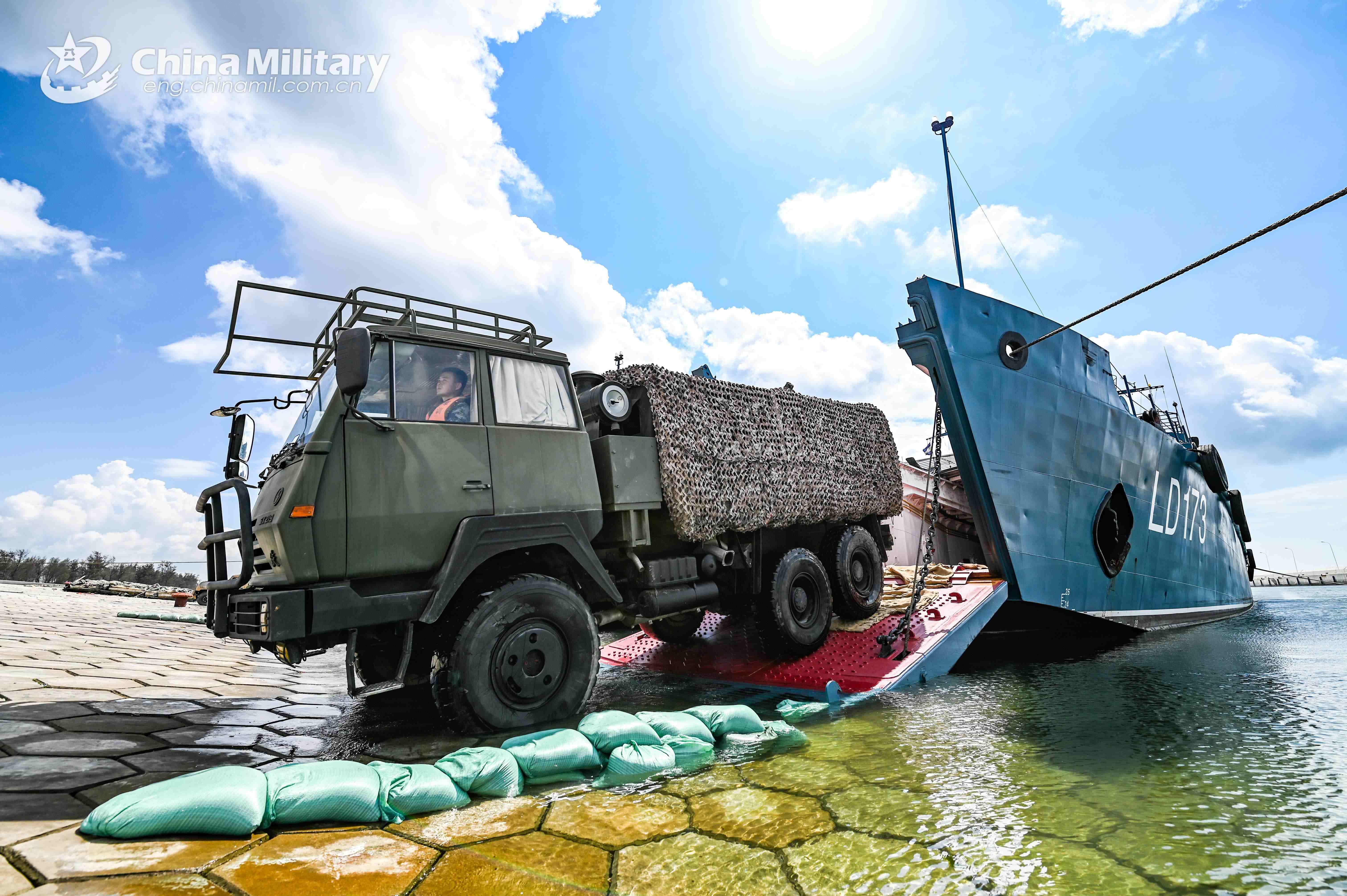 A 6x6 military truck attached to a brigade of the PLA 73rd Group Army pulls out of a military RO-RO ferry vessel during a loading-unloading training exercise from May 18 to 21, 2021. (eng.chinamil.com.cn/Photo by Lin Jiayu)