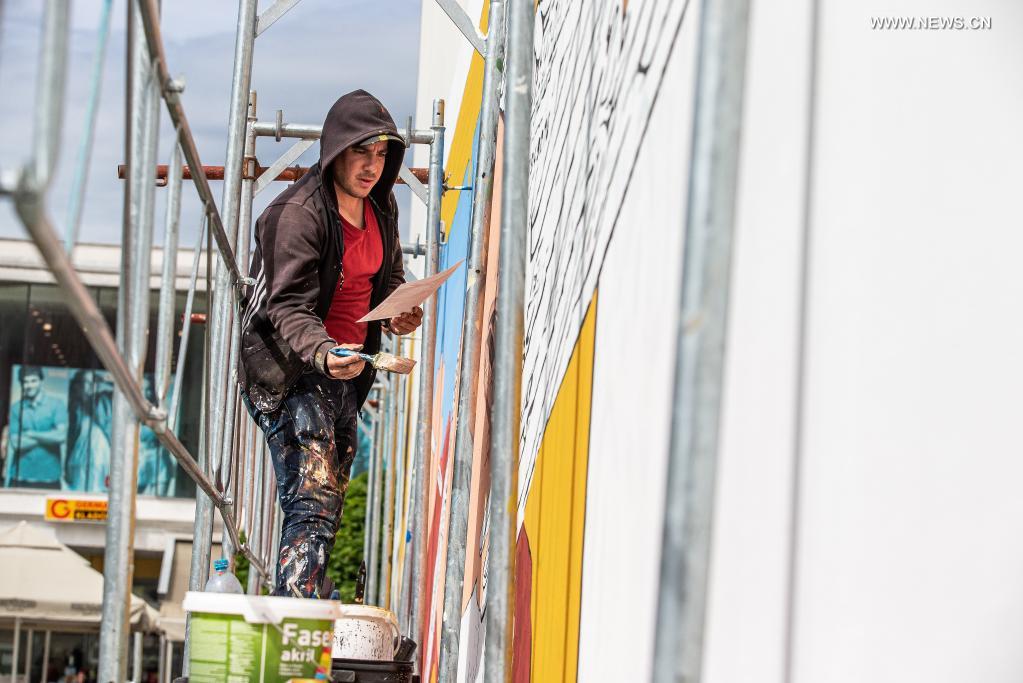An artist paints a mural on the wall of a building in Vukovar, Croatia, May 27, 2021. Street art festival VukovART, which features murals created by world-famous artists on the walls and sidewalks, is held in Vukovar for the fifth year in a row. (Davor Javorovic/Pixsell via Xinhua)