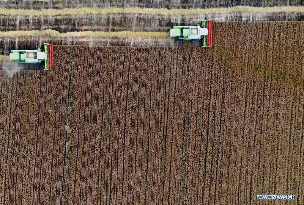 Aerial photo taken on May 27, 2021 shows wheat-reaping combine harvesters at work in Longwanggou rural revitalization demonstration area in Baofeng County, central China's Henan Province. Summer harvest has begun in Henan Province, one of China's main wheat production areas. (Xinhua/Li Jianan)