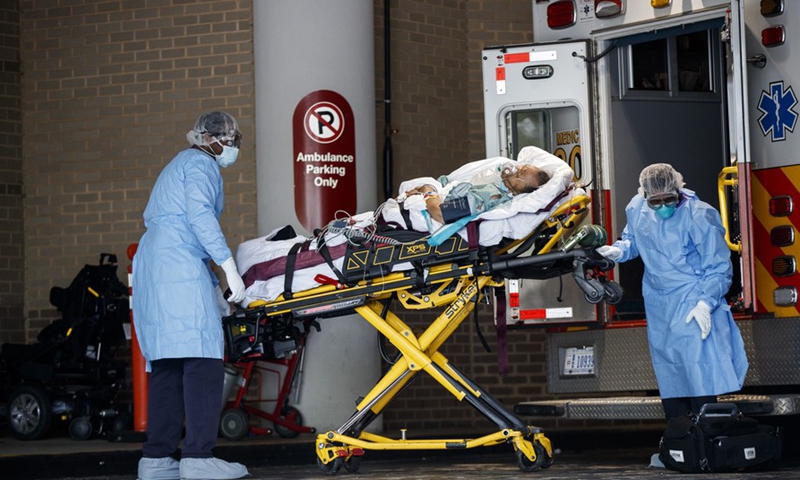 Medical workers transport a patient at George Washington University Hospital in Washington D.C., the United States, on April 27, 2020. (Photo/Xinhua)