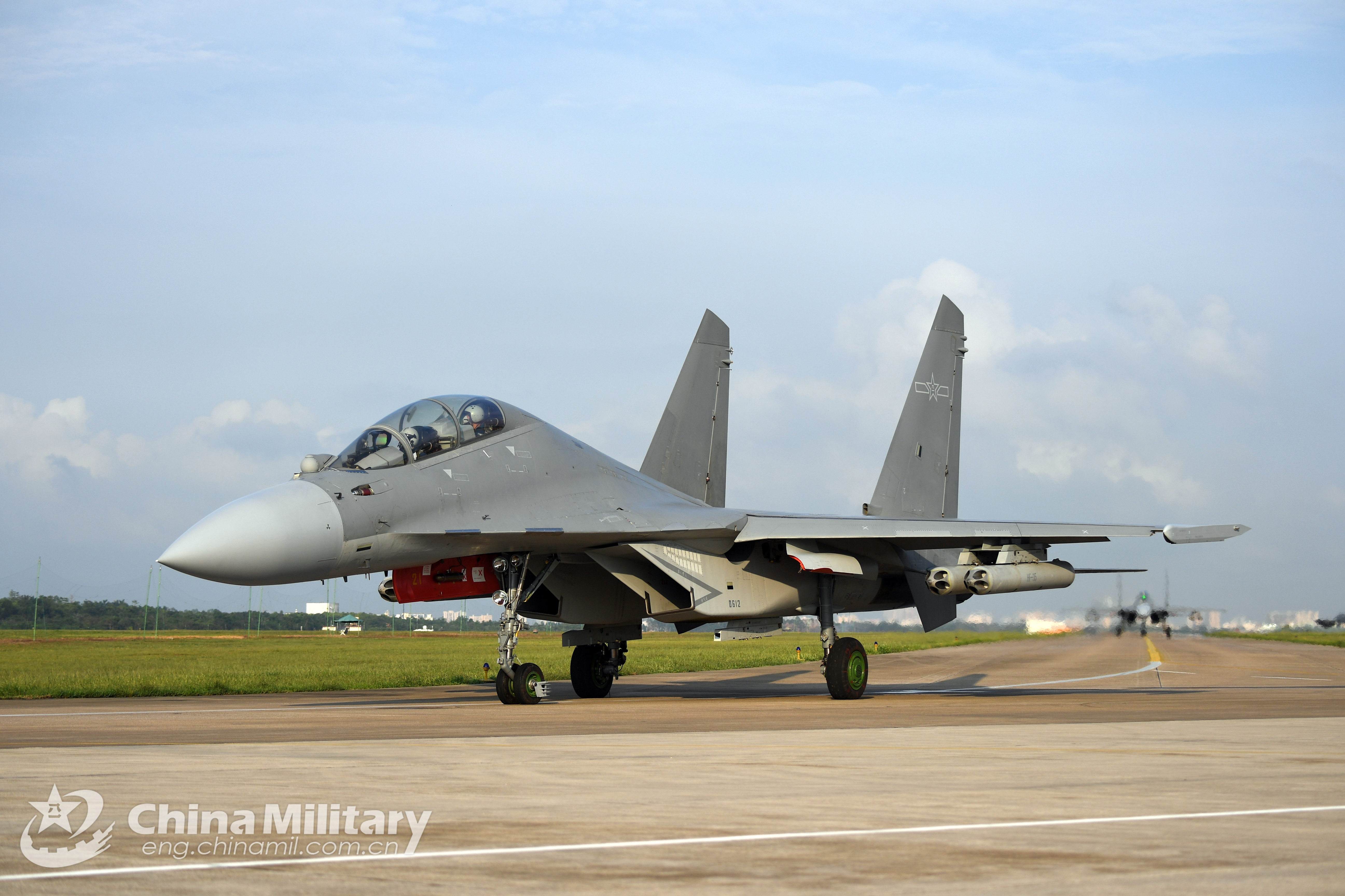 A fighter jet attached to an air force base under the PLA Southern Theater Command taxis on the runway of a military airport in south China before takeoff for a joint training exercise involving multi-type fighter jets on May 14, 2021. (eng.chinamil.com.cn/Photo by Fan Yishu)