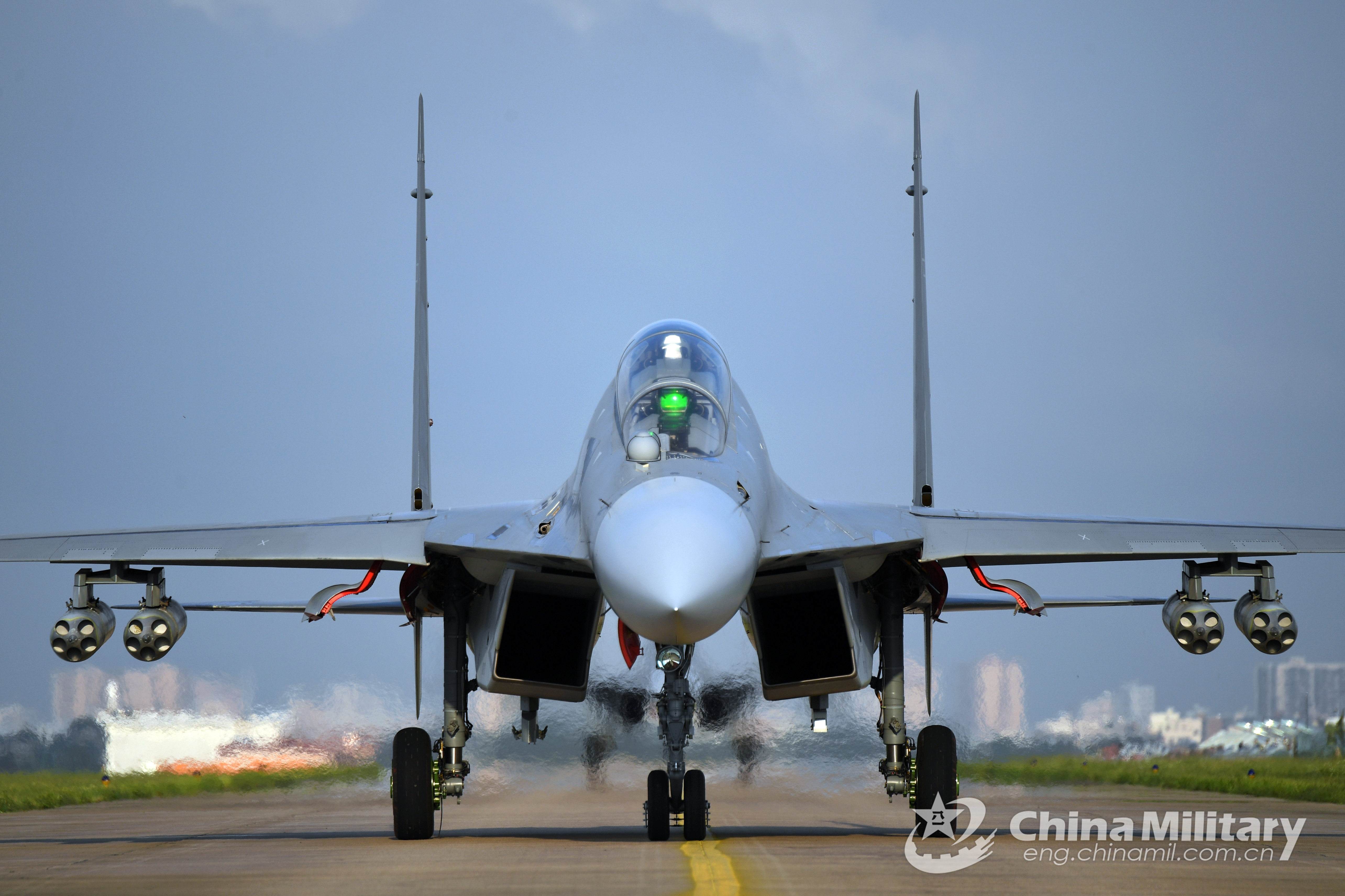 A fighter jet attached to an air force base under the PLA Southern Theater Command taxis on the runway of a military airport in south China before takeoff for a joint training exercise involving multi-type fighter jets on May 14, 2021. (eng.chinamil.com.cn/Photo by Fan Yishu)