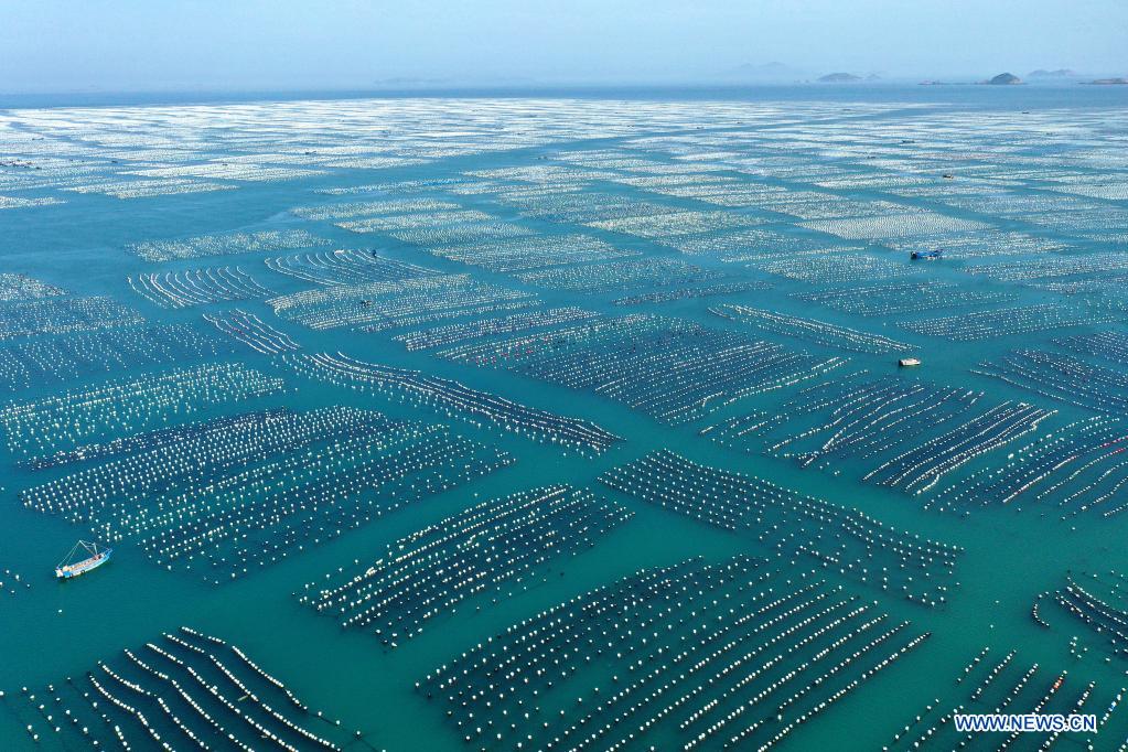 Aerial photo taken on May 30, 2021 shows a mussel breeding base in Shengsi County of Zhoushan City, east China's Zhejiang Province. (Photo by Yao Feng/Xinhua)