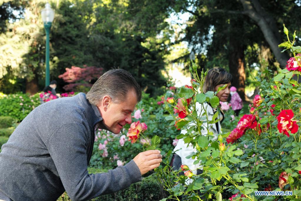 A man sniffs at a flower at a park in San Mateo, California, the United States, May 28, 2021. (Xinhua/Wu Xiaoling)